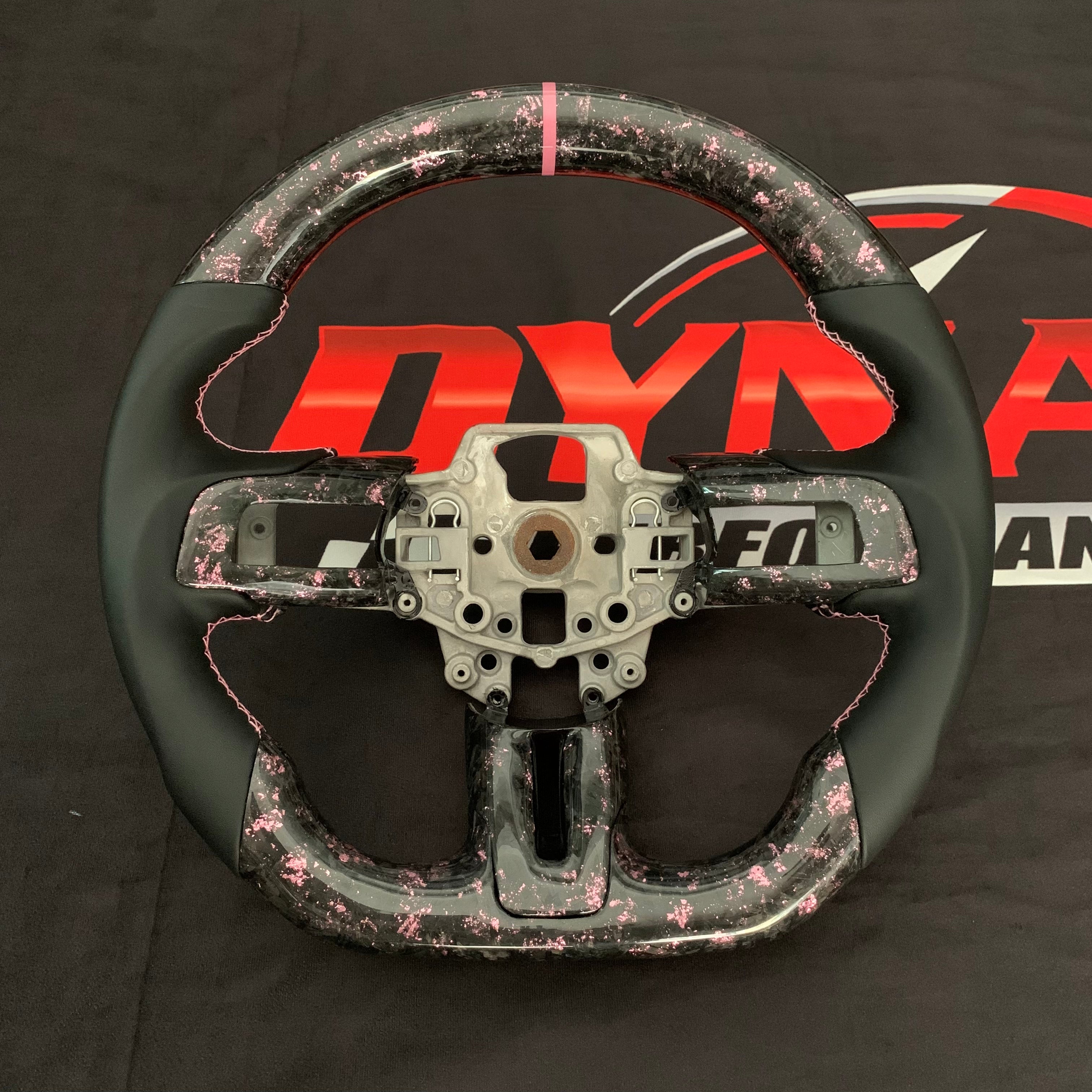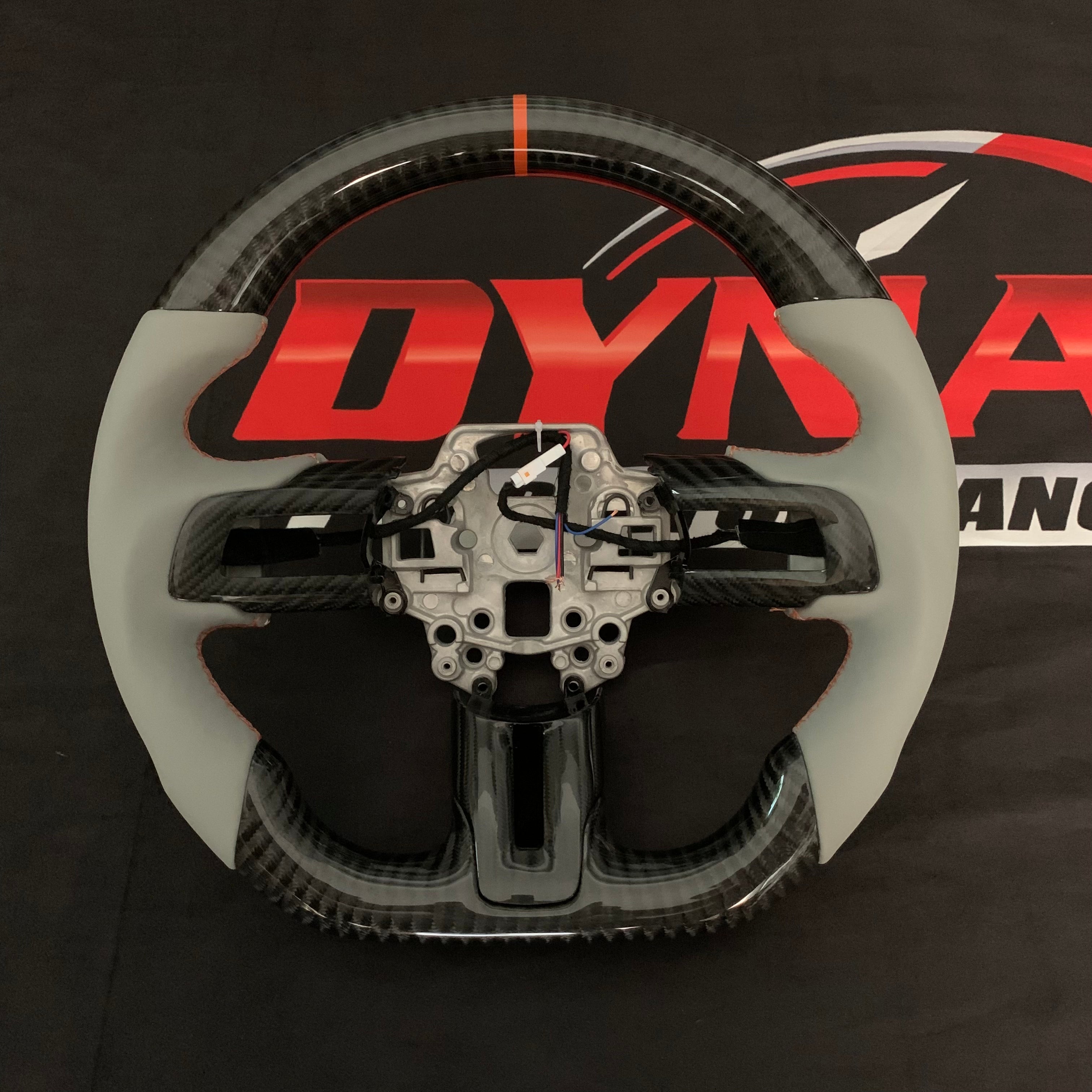 You can choose from a variety of materials - carbon fiber, leather, stitching colors, designs, airbag covers, paddle shifters, and additional features like heating, flat-bottom designs, and custom logos.